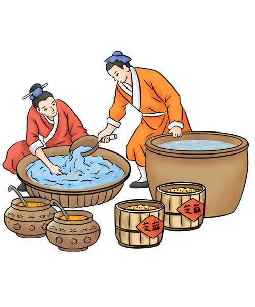 • 芝麻經過漂洗浸泡,既清除了芝麻中的并肩泥等雜質,又讓水分充分滲透到完整細胞內部,使凝膠體膨脹,再經過加熱炒籽,就可以使細胞破裂,油體原生質流出。